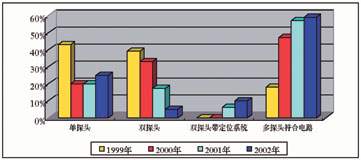 圖1 所示從1999年到2002年(2002年的數據是由上半年數據推算而來)單探頭、雙探頭、雙探頭帶定位系統和多探頭符合線路,四種不同核醫學設備每年各種類型所占比例?梢钥闯。最為明顯的是普通雙探頭在2002年僅僅占總數的5%,普通單探頭占總數25%,多探頭帶符合電路系統占總數59%。普通雙探頭帶X線定位系統占總數10%。可以看出單探頭SPECT和多探頭符合電路系統呈增長趨勢,尤其以多探頭符合電路系統更為明顯。